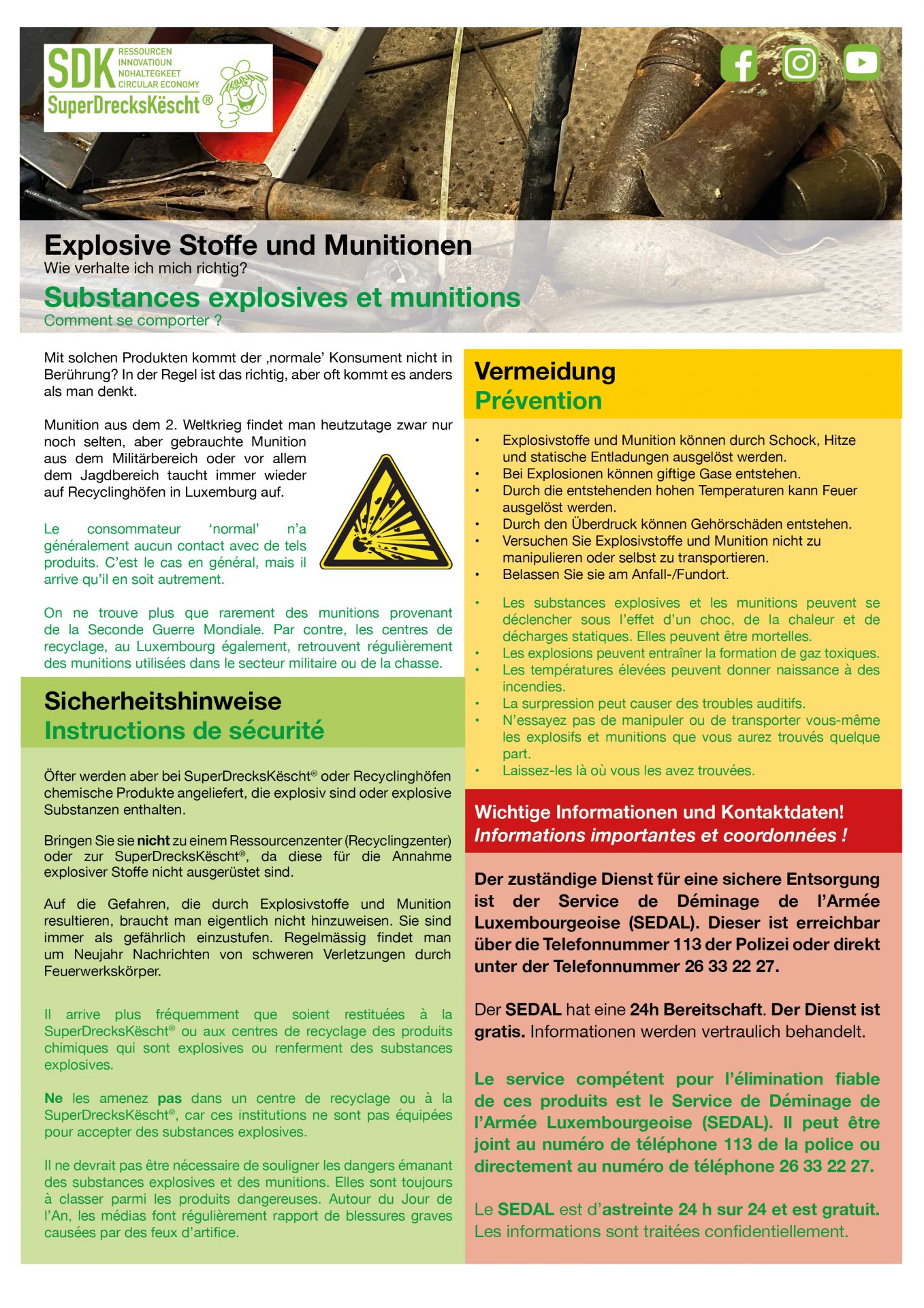 Pour éliminer ces substances explosives en toute sécurité, il faut joindre le Service de Déminage de l’Armée Luxembourgeoise (SEDAL) au numéro de téléphone de la police 113 ou directement au 26 33 22 27.