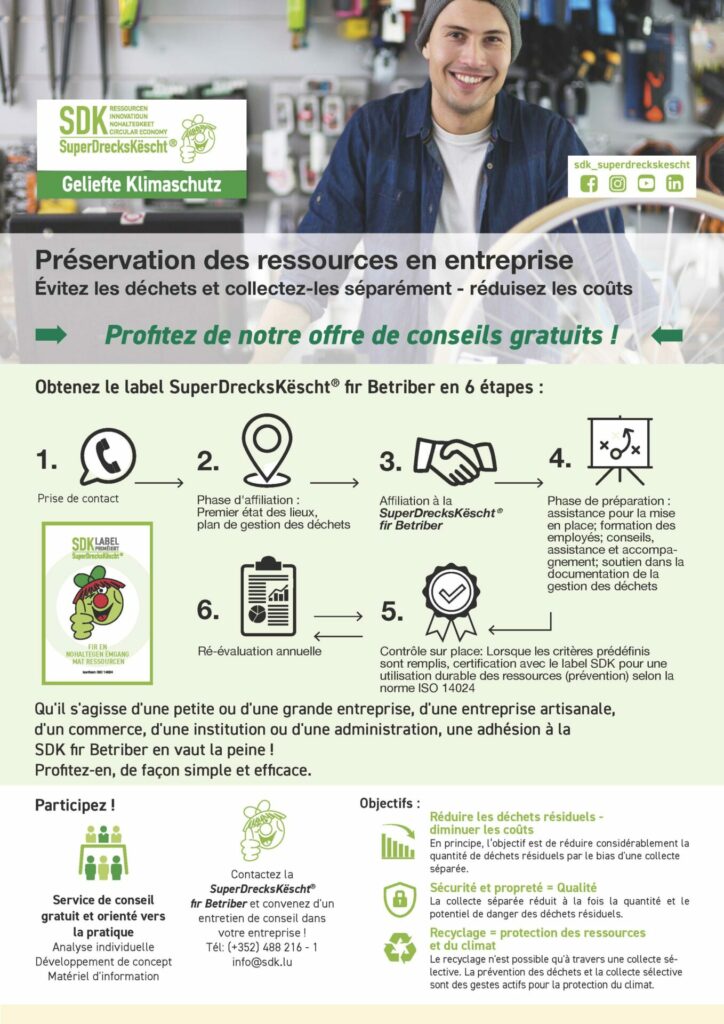 Le label SDK est un label de qualité reconnu pour une gestion durable des ressources dans les entreprises et les institutions, attribué sous le patronage de l’administration de l’environnement ainsi que de la Chambre des Métiers et de la Chambre de Commerce. Seules les entreprises qui mettent en pratique le schéma détaillé de gestion des déchets mis au point par la SDK se voient attribuer le label de qualité et sont ainsi ‘Label priméiert’.