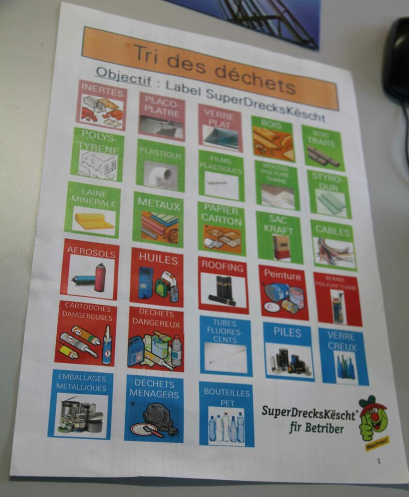 Pour avoir un chantier propre et avoir une gestion des déchets conforme à la législation les responsables du chantier – Ecole et Lycée Français de Luxembourg – ont mis en place une gestion des déchets suivant le concept de la SDK.