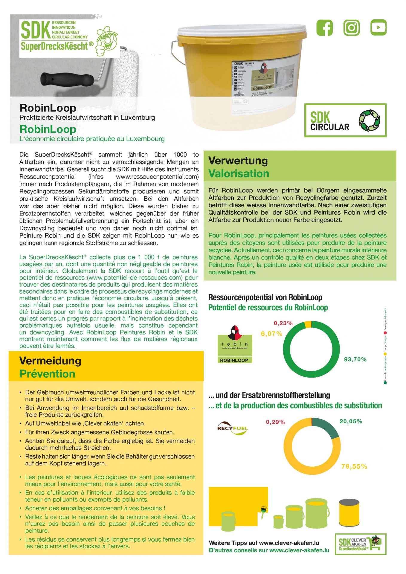 Die SDK sammelt jährlich über 1000 to Altfarben ein, darunter nicht zu vernachlässigende Mengen an Innenwandfarbe. Generell sucht die SDK mit Hilfe des Instruments Ressourcenpotential immer nach Produktempfängern, die im Rahmen von modernen Recyclingprozessen Sekundärrohstoffe produzieren und somit praktische Kreislaufwirtschaft umsetzen. Bei den Altfarben war das aber bisher nicht möglich. Diese wurden bisher zu Ersatzbrennstoffen verarbeitet, welches gegenüber der früher üblichen Problemabfallverbrennung ein Fortschritt ist, aber ein Downcycling bedeutet und von daher noch nicht optimal ist. Peintures Robin in Useldange und die SDK zeigen mit RobinLoop nun wie es gelingen kann regionale Stoffströme zu schliessen.