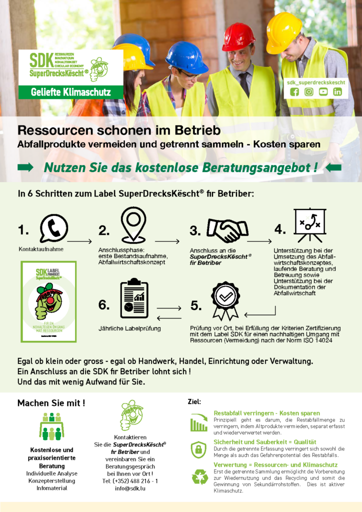 Das Label SDK ist ein anerkanntes Gütezeichen für einen nachhaltigen Umgang mit Ressourcen in Betrieben und Einrichtungen, das unter der Schirmherrschaft der Umweltverwaltung sowie der Chambre des Métiers und der Chambre de Commerce verliehen wird. Nur Betriebe, die das umfassende abfallwirtschaftliche Konzept der SDK in die tägliche Praxis umsetzen, erhalten das Label und sind somit ‘Label priméiert’.
