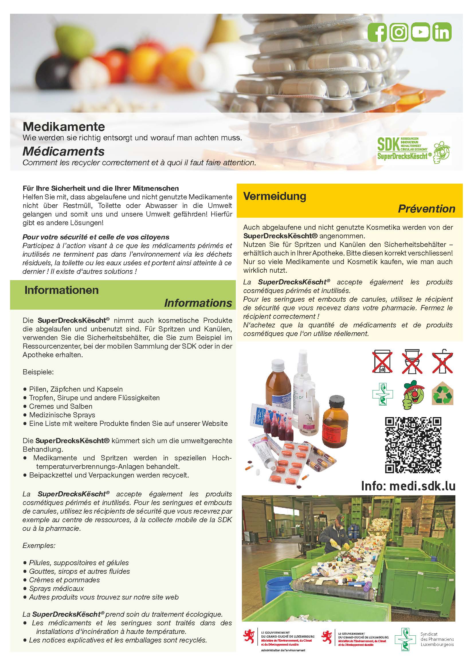 La collecte des médicaments, des seringues et des canules se fait en coopération avec les pharmacies luxembourgeoises (Syndicat des Pharmaciens Luxembourgeois) et le CPL (Comptoir Pharmaceutique).