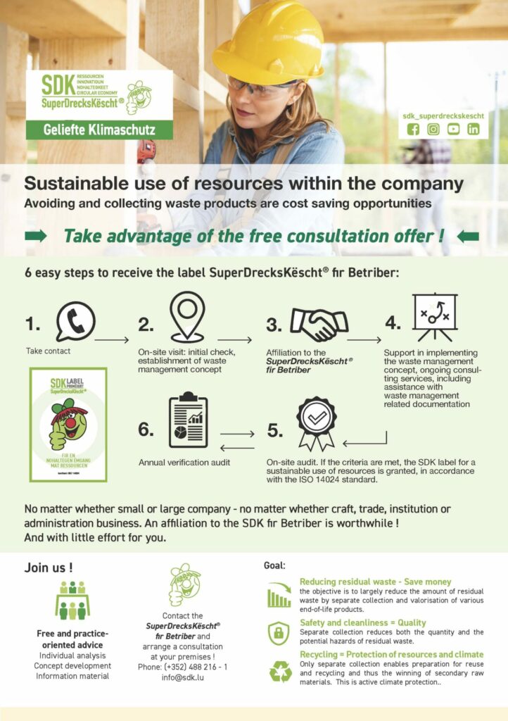 The Label SDK is an acknowledged label for the sustainable use of resources in companies and facilities, which is awarded under the auspices of the Environmental Administration and the Chamber of Crafts and Chamber of Commerce. Only the companies that have implemented the extensive concept for waste management of the SDK in their daily business routine receive the ‘Label priméiert’.