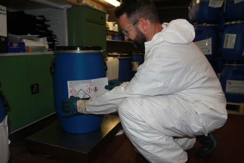 La sécurité de l’Homme et de l’environnement est garantie par différentes mesures : filtration des effluents gazeux par filtres à charbon actif, mesures de l’air ambiant et des effluents gazeux, formation régulière des employés, utilisation d’équipements de protection appropriés tels que combinaisons, lunettes, chaussures de sécurité et gants. Le tri des produits chimiques, des produits alcalins, des acides, des solvants et des pesticides se fait exclusivement dans des stations spéciales sous atmosphère contrôlée.